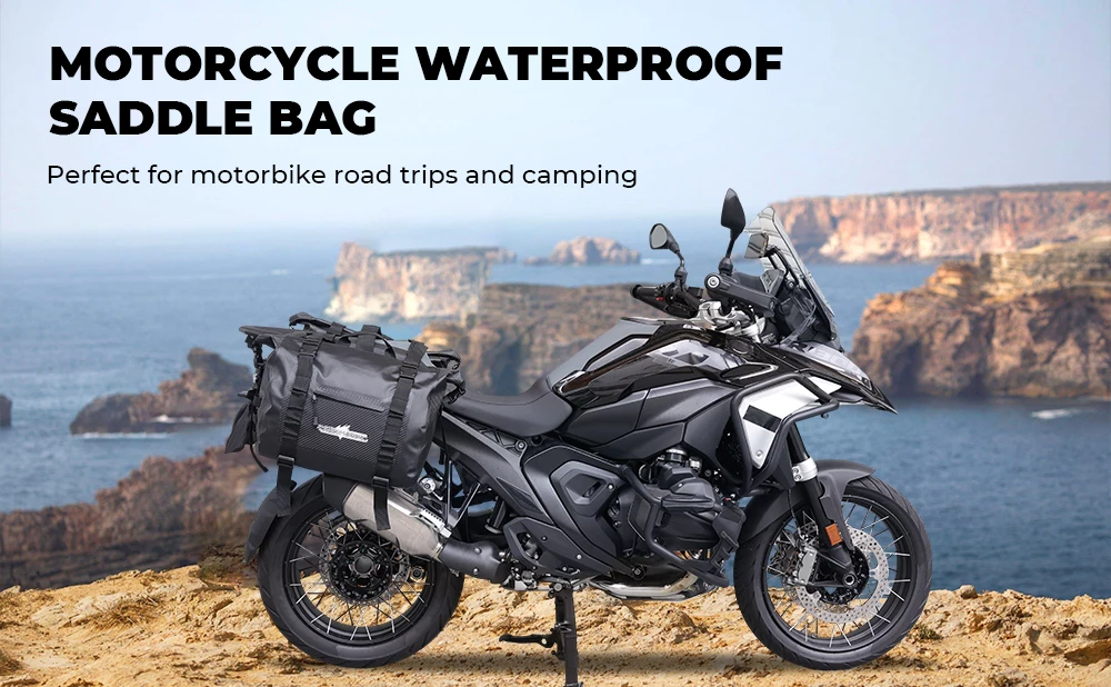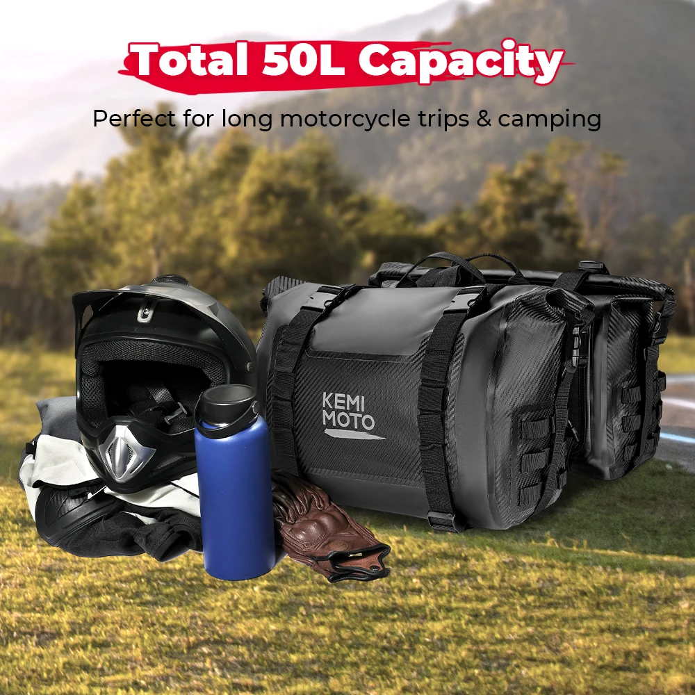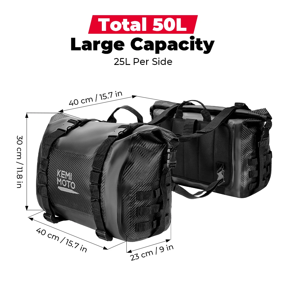 【Wide Suitability】These motorcycle saddlebags fit lots of motorcycle models including but not limited to adventure, sportster, softail, v-star, shadow, vulcan. (PS: The cruiser needs a back seat to fix the bags. Some motorcycle type seats with small thickness need side frame to fit.) 【Large Capacity】The capacity of motorcycle saddle bags is 50L (25L*2) and the load capacity is 50kg. It is designed with 2 separate bags, large enough to hold all kinds of items, such as helmets, water bottles, clothes, and camping gear. Two bags can be separated to use individually. 【Waterproof & Sturdy Saddle Bags】Made of thick and durable PVC material which is 100% waterproof and easy to clean. No worry about your luggage being exposed to rain or snow. The material of our pannier bag is more durable. The strong straps make your items safer - no escaping items even if just several stuff. 【Easy to Install】Saddlebags are connected with hook&loops and two straps, straps can be adjusted to different lengths. The distance between the two packages can be adjusted from 40CM-50CM long. The quick-release buckle makes it easy to access and close the bag. 【Special Design】The reflective logo develops visibility in the night. It is better for safer riding. Note: Please measure the distance between the highest point of the seat cushion and the exhaust pipe more than 14in to ensure can use.